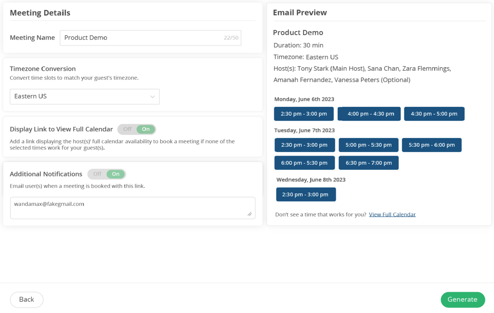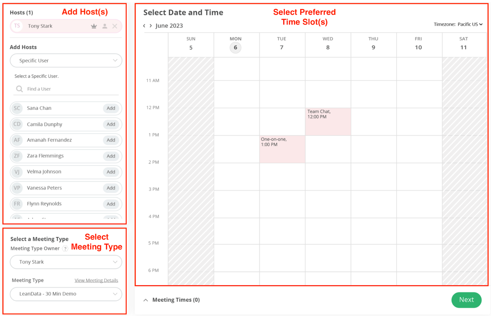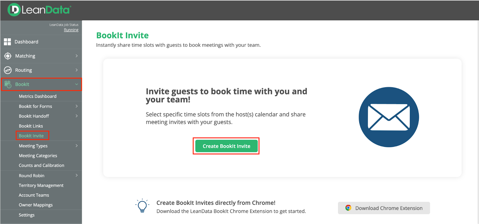 InformationTitleBookIt Links - BookIt Invite GuideURL NameBookItLinksBookItInviteGuide6901d5f4061a9Step-by-StepContents: OverviewUse CasesSetup - Authorizing UsersCreating a BookIt InviteAdding Host(s)Select a Meeting TypeSelect Preferred Time SlotsFinalize Meeting DetailsGoogle Chrome Extension Overview You can book meetings faster by sending a BookIt Invite. BookIt Invite allows you to curate and embed your preferred meeting times directly within your emails, Outreach Sequences, and Slack messages, allowing your invitees to seamlessly schedule a meeting at the perfect time. BookIt Invites can be created directly in LeanData BookIt or via a Chrome Extension that provides the fastest way to schedule meetings as you work. Use Cases Send Times For a 1-1 Meeting: Guide invitees to book a time that works best for your schedule. Select your preferred time slots and easily embed them in your email for the most seamless scheduling experience. Send Times for a Group Meeting: Make group scheduling a breeze. Easily view and propose shared time slots across your team members (e.g. SDR and AE) within an email, eliminating any need for manual coordination or back-and-forth. Setup - Authorizing Users In order to use BookIt Invite, you must first be authorized for BookIt Links and ensure your calendar is connected. Please reach out to the LeanData Admin in your organizations and have them follow the Authorization Instructions in the BookIt Implementation Guide. If you are already authorized for other BookIt Links, you may skip this step. Creating a BookIt Invite In order to create a BookIt Invite for your specified time, from within LeanData, navigate to BookIt > BookIt Invite > Click on the Create BookIt Invite button. You will be taken to a page where you can configure your meeting parameters, including selecting your Main Host, additional required or optional Hosts, Meeting Type, and a time slot from the visual calendar. Adding Host(s) By default, the current User will be selected as the Main Host and will be the Owner of the Meeting. If you are only sending an invite to meet with yourself, you can move on to selecting a Meeting Type. If you would like to add additional Host(s), you can search for Users and click the Add button by each User you would like to add as a Host. Each additional Host will be designated as a Required Host by default, indicated by a darkened icon next to their User. The calendar availability displayed will adjust to reflect the availability of all Required Hosts. You can designate someone as an Optional Host by deselecting the Person icon by their User, which will adjust the displayed time frame in the calendar. You can also add Hosts by selecting them from their BookIt Round Robin Pool, by selecting BookIt Round Robin Pool in the dropdown under Add Hosts. Select a Meeting Type In order to create an Invite, you will need to specify the Meeting Type you would like to use. You can use Meeting Types created by an Admin, unlocked Personal Meeting Types created by other Users, or you can create your own Meeting Type. Under Meeting Type Owner, select the User whose Meeting Types you would like to use, or select Admin Managed to see the available Admin Managed Meeting Types. Then select the specific Meeting Type you would like to use. For more detailed information on Meeting Types, please see the Meeting Types section of the BookIt Settings Guide. Select Preferred Time Slots The calendar to the right will display the calendar availability for all of your Required Hosts. Select your preferred time slots for the meeting. The meeting duration will reflect the Meeting Type you selected in the previous step. You can select more than one preferred time slot to give your invitee more options. As you select time slots, your selected time slots will be listed in the Meeting Times section at the bottom. When you are finished selecting your preferred times, click Next at the bottom. Finalize Meeting Details You will be taken to a page where you can finalize your meeting details. On this page you can customize: Meeting Name: This will be the title of the block that you can paste into your message. This is not correspond to the actual calendar event title.Timezone: Your invite will display times in the chosen Timezone.Display Link to View Full Calendar: If enabled, this will display a link where an invitee can see full calendar availability if none of your preferred times work.Additional Notifications: You can specify who should receive notification when meetings are booked with this link. On the right side, you will see a preview of how your invite will look in the email you send. When you are done, click the Generate button in the bottom right. You will be taken to a page with your invite details and a button to copy the invite you just created. After copying the invite, you can paste it into an email, Slack message, sales engagement sequence or however else you would like to send it to your invitees. Google Chrome Extension If you would like to create a BookIt invite directly from the Chrome browser, you can install the BookIt Chrome Extension. For instructions on setting up and using the Google Chrome Extension, please see the Google Chrome Extension Guide. For additional assistance please submit a ticket to LeanData Support.