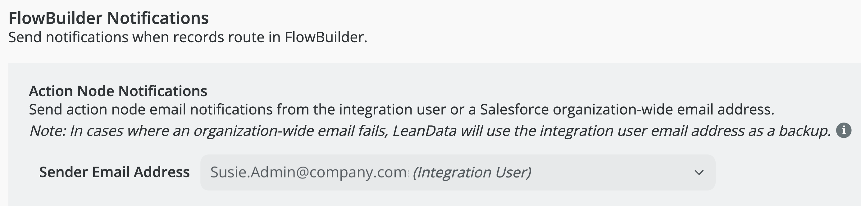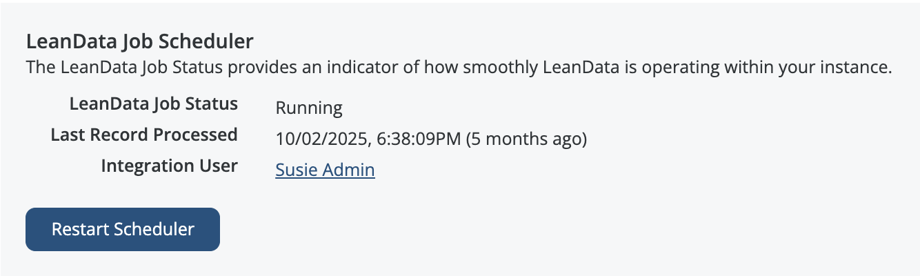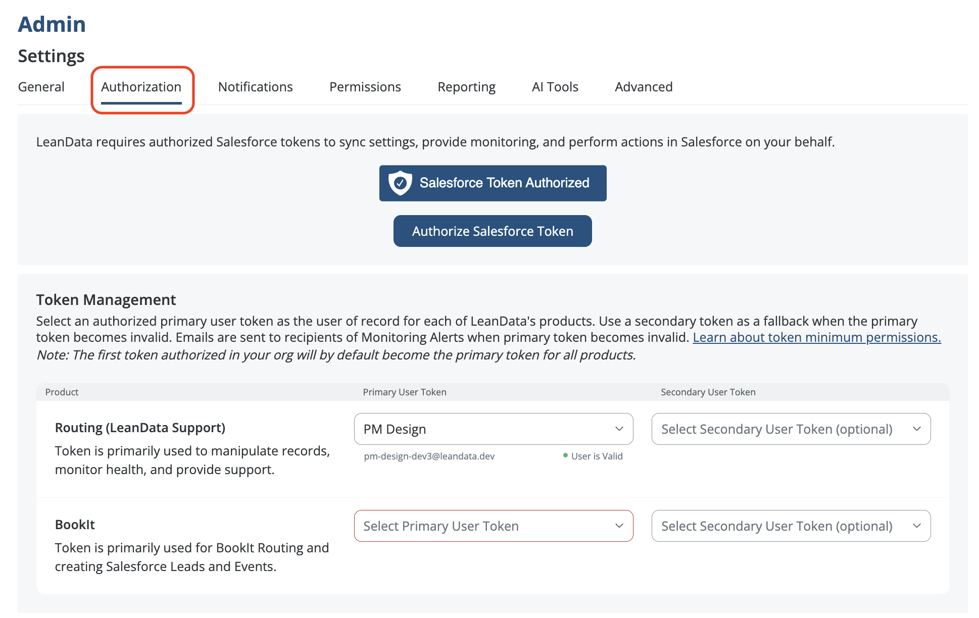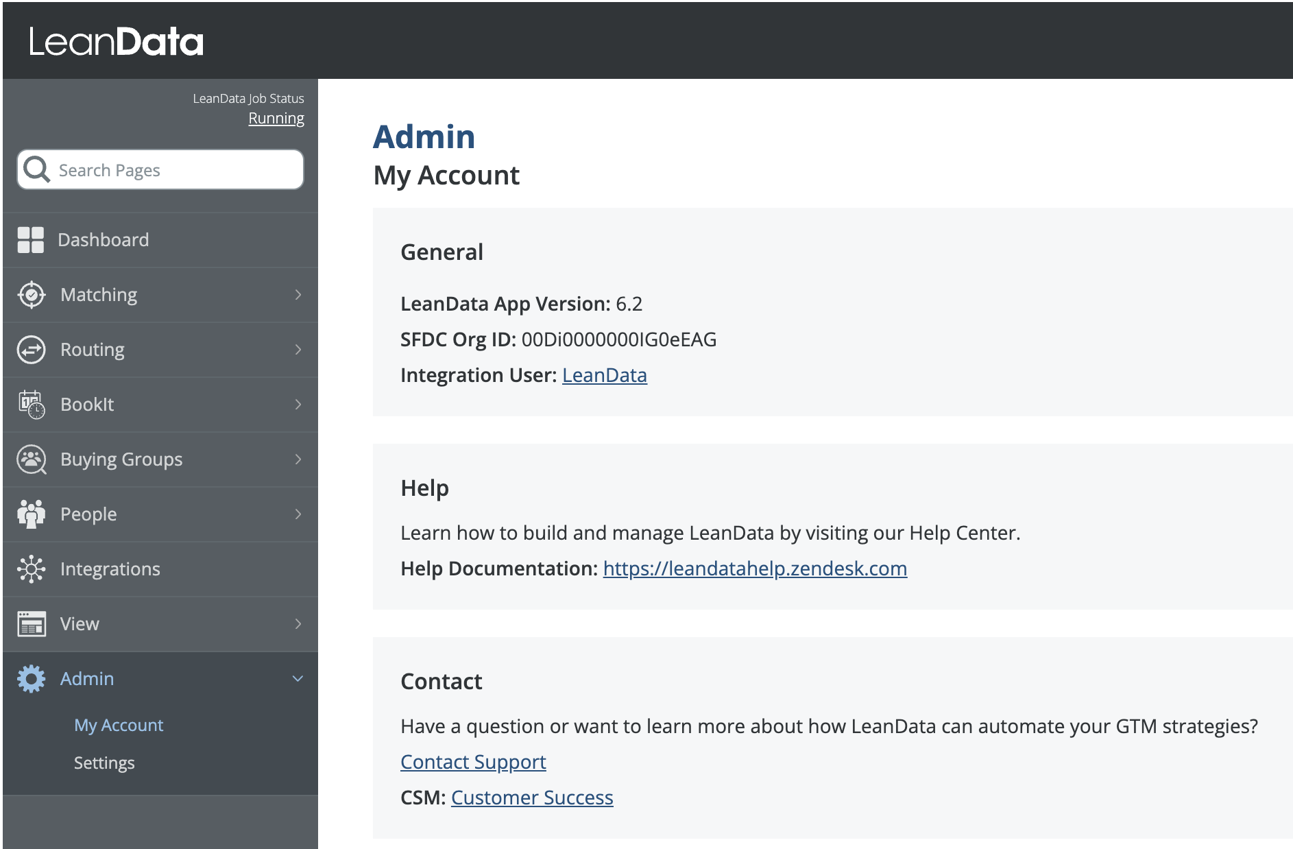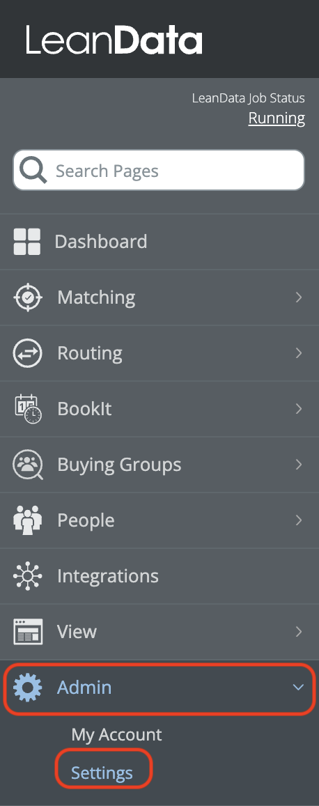 InformationTitleLeanData Admin - Admin Settings GuideURL NameLeanDataAdminAdminSettingsGuide6901e79fe7ee0Step-by-StepContents: OverviewGeneral SettingsLeanData Job Scheduler & LeanData Integration UserImport / Export LeanData In-Product SettingsDownload Fields Used in LeanDataAuthorizationNotificationsPermissionsReportingAdvanced Overview The Admin section page in LeanData will help you to control and manage the administrative aspects of your LeanData products, including checking on your LeanData Continuous Job status, changing your Integration User, importing settings, configuring monitoring alerts, managing permissions, and configuring how long logs will be retained. You can navigate to this page by navigating to the LeanData Dashboard, then Admin > Settings. LeanData Enhanced Page Search To find any page within the LeanData app, you can leverage the search bar in the upper left to search for a specific page and go to it with a single click, rather than navigating through the menus. Account Information Information about your LeanData account can be found under Admin > My Account. On this page you can find useful information such as your current LeanData App version, your Salesforce Org Id, the current integration user, as well as your LeanData Customer Success Manager. General Settings The General Settings can be found in the General tab on the Admin Settings page. LeanData Job Scheduler & LeanData Integration User If you want to check on the status of the LeanData continuous Apex job, you can see the current status in the LeanData Job Scheduler section. For details on the different job statuses, please see the LeanData Job Status FAQ. The LeanData Integration User is the User of record for all LeanData Actions. You can designate a User solely for LeanData processing, but you can designate an actual Admin User as the LeanData Integration User. If you ever need to change the Integration User -- for instance if the current Integration User will be deactivated in Salesforce -- simply have your intended new Integration User log into Salesforce, navigate to this page, and click the Restart Scheduler button. Whichever User clicks this button will become the new LeanData Integration User. Import / Export LeanData In-Product Settings If you are migrating LeanData from one instance of Salesforce to another, you may want to carry over all of your in-product settings from the old instance to the new instance. To do this, click the Export Settings button in the Import/Export LeanData In-Product Settings section while you are logged into your old instance. After selecting which specific settings you would like to carry over, this will download a settings file. Once you have the settings file, log into the instance you would like to migrate the settings to, and navigate to this same section on the LeanData Dashboard > Admin > Settings page, and click Import Settings. This will prompt you to select the settings file from your computer. This will then apply the settings to your new instance. Download Fields Used in LeanData If you need to see a list of all of the Salesforce fields that are actively being used in your LeanData setup, from fields referenced in FlowBuilder, Mapped Account Fields, or Tiebreakers, you can download a CSV file from the Download Fields Used in LeanData section on this page. Authorization The Authorization tab on on the Admin Settings Page will allow you to authorize User Tokens for different LeanData products as well as generate access tokens for LeanData Routing API integrations. Token Authorization For more information on how to Authorize User Tokens, please see the Token Authorization Guide. API Key Management Here, you will be able to view and generate access keys for use with LeanData's Routing API. To generate a new key, enter a key label and click the Generate Key button. For more information about LeanData’s Routing API, please see LeanData API Documentation. Notifications The Notifications tab on the Admin Settings page will allow you to configure how administrative notifications from LeanData will be sent. Monitoring Alerts In order for LeanData to function, the LeanData Continuous job needs to run regularly. There is a monitoring job that will regularly check to see if that job is running properly. If not, a monitoring alert will be sent to all email addresses listed in the Recipients tab. You can also choose to send an additional notification to the LeanData Integration User by checking the box in the Monitoring Alerts section. Routing Alerts Sometimes, you may want to be notified if records are taking longer than a certain amount of time to get processed and routed in LeanData. In the Routing Alerts section, under Routing Delay Definition, you can designate a time frame, after which LeanData will send a delay notification if records are not processed after that time frame. You can also control how frequently you want notifications to be sent in the event that a delay remains unresolved in the Email Frequency section. FlowBuilder Notifications Action Node Notifications By default, notifications sent from FlowBuilder will be sent from the LeanData Integration Users email address in Salesforce. If you would prefer that these notifications be sent from a Salesforce organization-wide email address instead, you can select which one you would like to use here. If the organization-wide email address fails, LeanData will default back to the LeanData Integration User. Chatter Notifications If you want LeanData to send Chatter notifications when it routes records, you can enable that in the Chatter Notifications section. This will only control notifications sent via LeanData, and will not affect the standard Chatter notifications you have configured in Salesforce when certain updates are made to records. Recipients On the Recipients tab, you will be able to configure the recipients of your Monitoring Alerts or Routing Delay Alerts. Permissions On the Permissions tab, you 