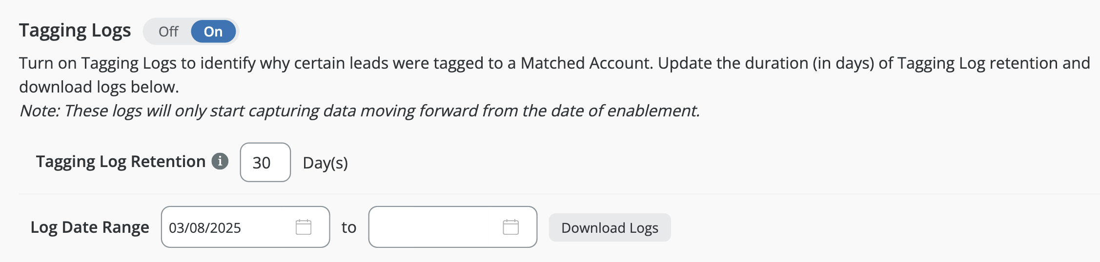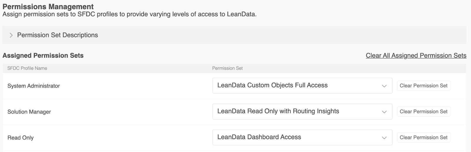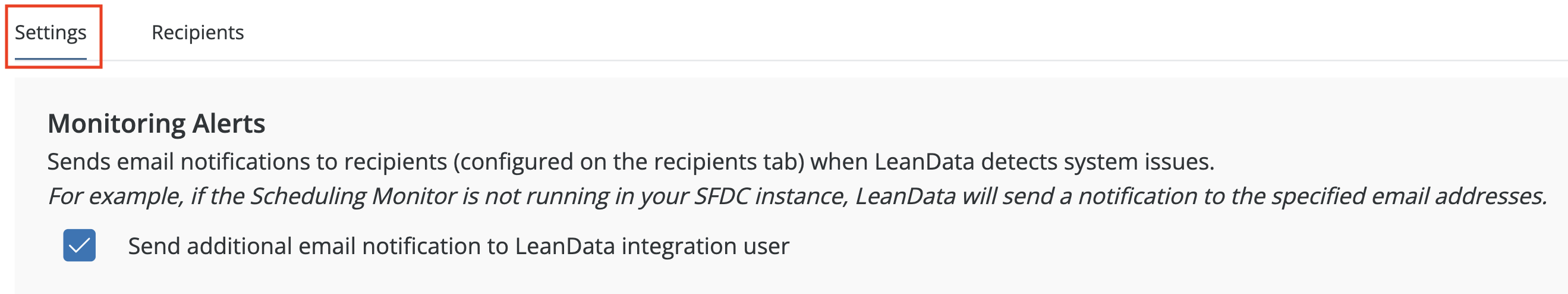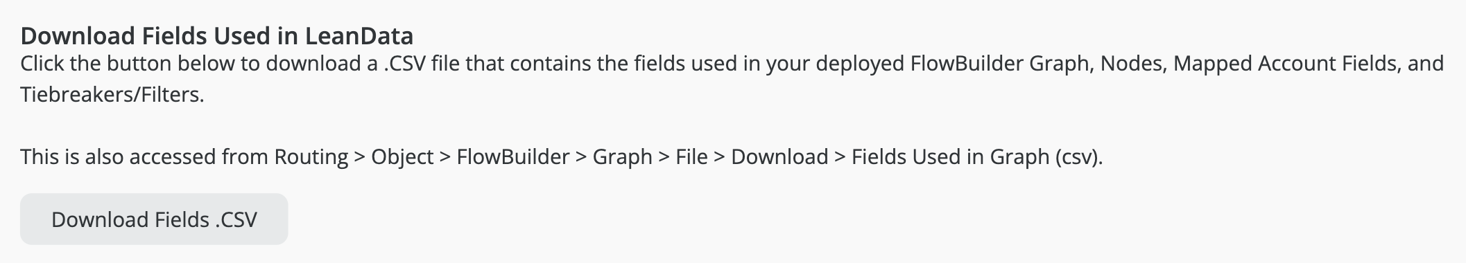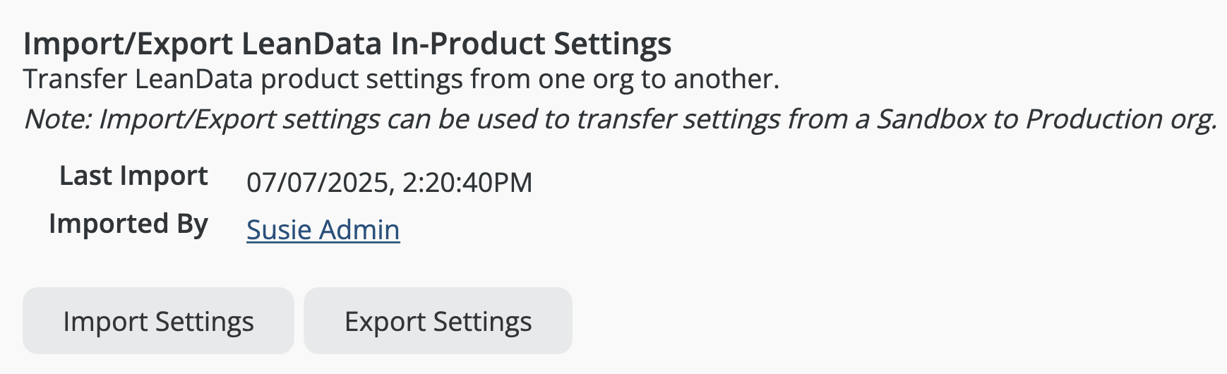 InformationTitleLeanData Admin - Admin Settings GuideURL NameLeanDataAdminAdminSettingsGuide6901e79fe7ee0Step-by-StepContents: OverviewGeneral SettingsLeanData Job Scheduler & LeanData Integration UserImport / Export LeanData In-Product SettingsDownload Fields Used in LeanDataAuthorizationNotificationsPermissionsReportingAdvanced Overview The Admin section page in LeanData will help you to control and manage the administrative aspects of your LeanData products, including checking on your LeanData Continuous Job status, changing your Integration User, importing settings, configuring monitoring alerts, managing permissions, and configuring how long logs will be retained. You can navigate to this page by navigating to the LeanData Dashboard, then Admin > Settings. LeanData Enhanced Page Search To find any page within the LeanData app, you can leverage the search bar in the upper left to search for a specific page and go to it with a single click, rather than navigating through the menus. Account Information Information about your LeanData account can be found under Admin > My Account. On this page you can find useful information such as your current LeanData App version, your Salesforce Org Id, the current integration user, as well as your LeanData Customer Success Manager. General Settings The General Settings can be found in the General tab on the Admin Settings page. LeanData Job Scheduler & LeanData Integration User If you want to check on the status of the LeanData continuous Apex job, you can see the current status in the LeanData Job Scheduler section. For details on the different job statuses, please see the LeanData Job Status FAQ. The LeanData Integration User is the User of record for all LeanData Actions. You can designate a User solely for LeanData processing, but you can designate an actual Admin User as the LeanData Integration User. If you ever need to change the Integration User -- for instance if the current Integration User will be deactivated in Salesforce -- simply have your intended new Integration User log into Salesforce, navigate to this page, and click the Restart Scheduler button. Whichever User clicks this button will become the new LeanData Integration User. Import / Export LeanData In-Product Settings If you are migrating LeanData from one instance of Salesforce to another, you may want to carry over all of your in-product settings from the old instance to the new instance. To do this, click the Export Settings button in the Import/Export LeanData In-Product Settings section while you are logged into your old instance. After selecting which specific settings you would like to carry over, this will download a settings file. Once you have the settings file, log into the instance you would like to migrate the settings to, and navigate to this same section on the LeanData Dashboard > Admin > Settings page, and click Import Settings. This will prompt you to select the settings file from your computer. This will then apply the settings to your new instance. Download Fields Used in LeanData If you need to see a list of all of the Salesforce fields that are actively being used in your LeanData setup, from fields referenced in FlowBuilder, Mapped Account Fields, or Tiebreakers, you can download a CSV file from the Download Fields Used in LeanData section on this page. Authorization The Authorization tab on on the Admin Settings Page will allow you to authorize User Tokens for different LeanData products as well as generate access tokens for LeanData Routing API integrations. Token Authorization For more information on how to Authorize User Tokens, please see the Token Authorization Guide. API Key Management Here, you will be able to view and generate access keys for use with LeanData's Routing API. To generate a new key, enter a key label and click the Generate Key button. For more information about LeanData’s Routing API, please see LeanData API Documentation. Notifications The Notifications tab on the Admin Settings page will allow you to configure how administrative notifications from LeanData will be sent. Monitoring Alerts In order for LeanData to function, the LeanData Continuous job needs to run regularly. There is a monitoring job that will regularly check to see if that job is running properly. If not, a monitoring alert will be sent to all email addresses listed in the Recipients tab. You can also choose to send an additional notification to the LeanData Integration User by checking the box in the Monitoring Alerts section. Routing Alerts Sometimes, you may want to be notified if records are taking longer than a certain amount of time to get processed and routed in LeanData. In the Routing Alerts section, under Routing Delay Definition, you can designate a time frame, after which LeanData will send a delay notification if records are not processed after that time frame. You can also control how frequently you want notifications to be sent in the event that a delay remains unresolved in the Email Frequency section. FlowBuilder Notifications Action Node Notifications By default, notifications sent from FlowBuilder will be sent from the LeanData Integration Users email address in Salesforce. If you would prefer that these notifications be sent from a Salesforce organization-wide email address instead, you can select which one you would like to use here. If the organization-wide email address fails, LeanData will default back to the LeanData Integration User. Chatter Notifications If you want LeanData to send Chatter notifications when it routes records, you can enable that in the Chatter Notifications section. This will only control notifications sent via LeanData, and will not affect the standard Chatter notifications you have configured in Salesforce when certain updates are made to records. Recipients On the Recipients tab, you will be able to configure the recipients of your Monitoring Alerts or Routing Delay Alerts. Permissions On the Permissions tab, you 