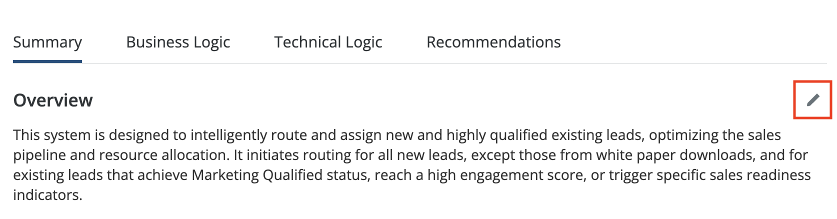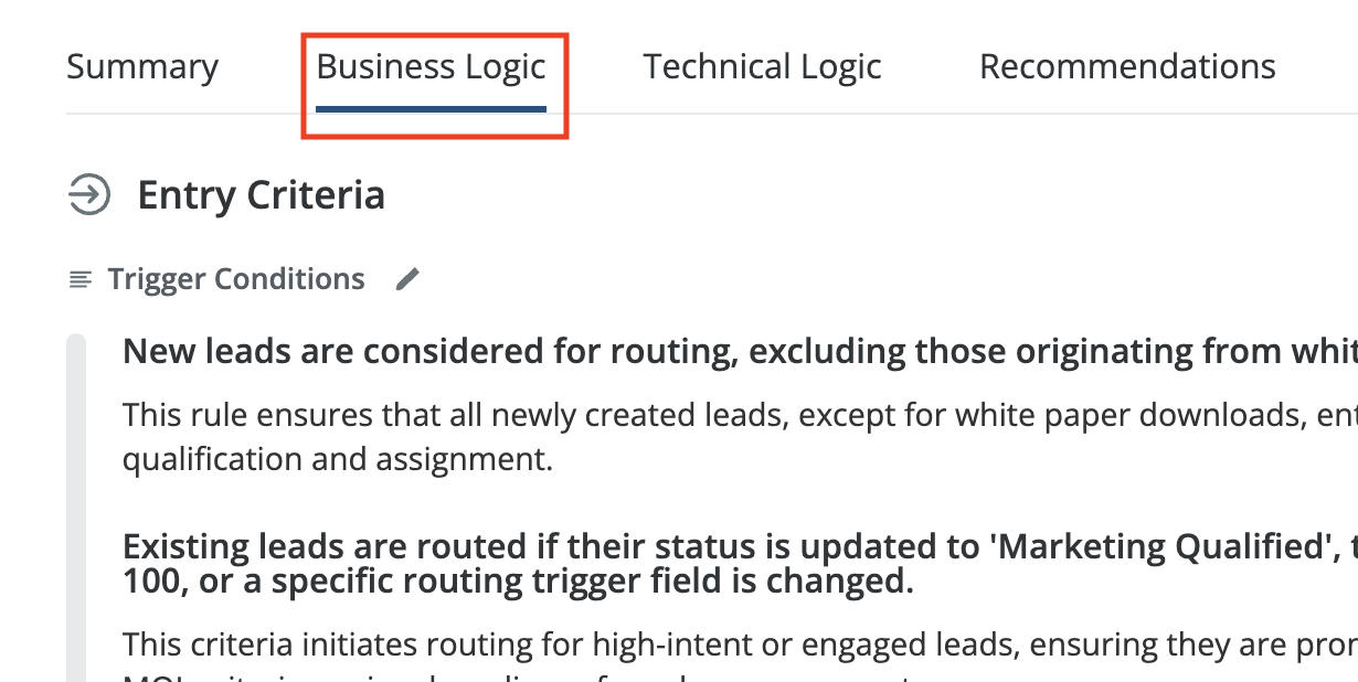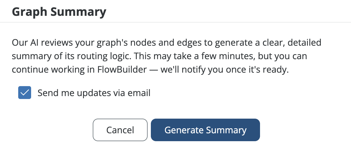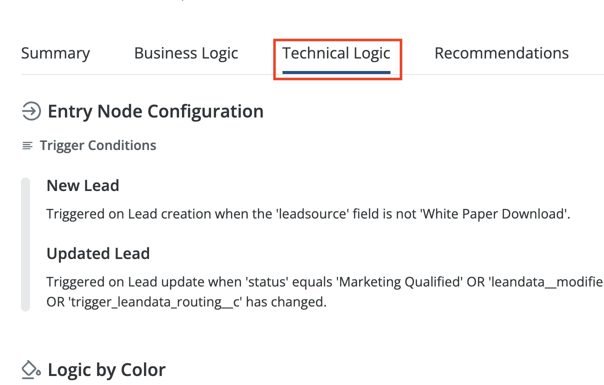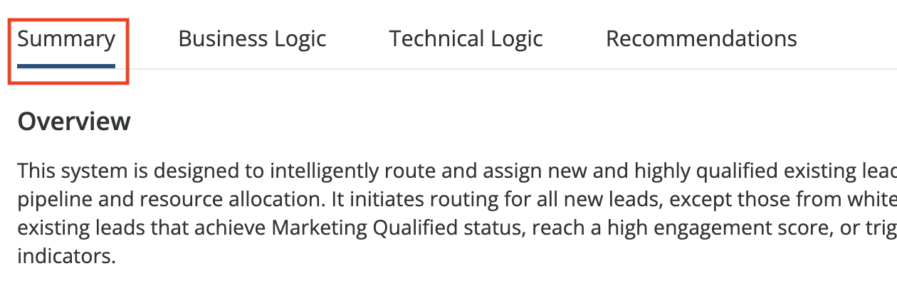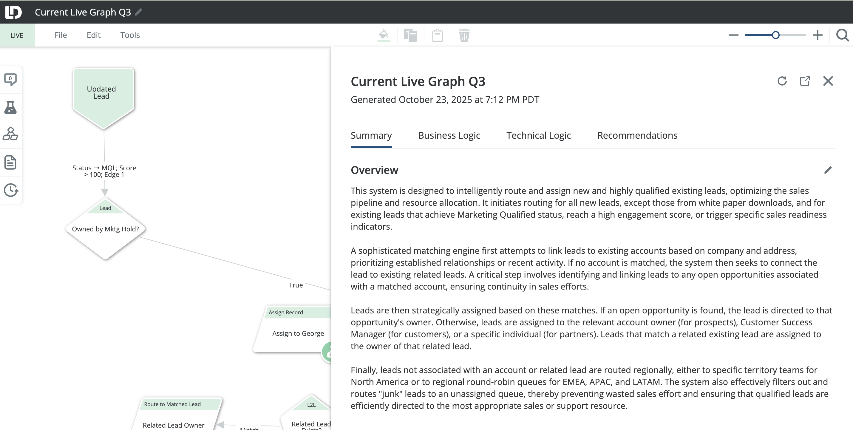 InformationTitleRouting - AI Graph SummaryURL NameRoutingAIGraphSummary6901c862d2d64Step-by-StepContents OverviewExample Use CasesEnabling AI Graph SummaryGenerating an AI Graph SummaryInterpreting Graph SummariesWorking with SummariesPermissions and AccessUsing Your Own API KeyFAQs Overview LeanData's AI Graph Summary feature uses artificial intelligence to generate natural language explanations of your FlowBuilder Routing Graphs. This powerful tool automatically analyzes your routing logic and creates summaries that explain what your graph does, how it works, and where there may be opportunities for optimization. AI Graph Summary helps you understand complex routing configurations by breaking them down into clear business logic, technical details, and actionable recommendations. Whether you're onboarding new team members, troubleshooting routing issues, or optimizing your processes, AI Graph Summary provides the insights you need in an easy-to-understand format. Please Note: AI Graph Summary is currently only available to LeanData Premium subscribers. Example Use Cases New Administrator Onboarding: Quickly understand inherited routing graphs without extensive documentation or tribal knowledge.Cross-Team Collaboration: Share clear explanations of routing logic with Sales, Marketing, and leadership teams.Troubleshooting: Identify potential issues, gaps, or redundancies in your routing configuration.Process Optimization: Discover opportunities to improve routing efficiency based on AI-generated recommendations.Documentation: Create and maintain up-to-date documentation of your routing processes.Knowledge Transfer: Preserve institutional knowledge when team members transition roles. Enabling AI Graph Summary LeanData administrators can control access to AI functionality from LeanData Admin Settings. To enable, navigate to Admin > Settings > AI Tools in the LeanData app.Toggle on the AI Graph Summary and AI Graph Comparison setting. By default, LeanData uses its own Gemini key as the LLM provider. If you prefer to use your own Gemini key, you can provide it in Integrations. See the LeanData Admin - Using Your Own Gemini API Key for more information. Generating an AI Graph Summary From the LeanData App navigate to Routing > [Object] > FlowBuilder, then open a routing graph. You can generate summaries for drafts as well as deployed graphs. From within a FlowBuilder graph, click the AI Graph Summary button in the upper left toolbar to generate a summary of the currently displayed graph. If generating a summary for the first time, you can designate if you wish to receive an update in the pop-up modal. Depending on the complexity of your graph, summary generation can take up to several minutes. You may continue to work on your FlowBuilder graph while the summary generates. Once complete, the summary will be displayed in a panel with multiple sections: Please Note: AI Graph Summary can generate summaries and invalid graphs as well. If your graph is invalid, the summary will include a validity warning along with the analysis. Interpreting Graph Summaries AI-generated summaries follow a consistent, structured format designed to serve both technical and non-technical audiences. Each summary includes the following sections/tabs: Summary Tab The Summary tab provides a high-level overview of the graph's purpose, business outcome, and key structure. This section is written for non-technical stakeholders such as Sales, Marketing, and leadership teams who need to understand what the graph accomplishes without diving into technical details. Business Logic Tab The Business Logic section outlines more detail, breaking down into the graph into sections organized by color and node types and plain language description behind the intent of these sections. This tab may include: Flow Name & Purpose: A clear description of what the flow is designed to accomplish.Graph Groups: Implied or actual graph groups, including their colors and names (if applicable).Entry Criteria: What triggers a record to enter the flow.Routing Rules: Description of how records are routed by geography, product, named representative, or channel.Matching Rules: Objects used for matching and simplified logic (e.g., email match, domain match).Conversion & Assignment: When and how leads convert and how ownership is assigned.Alerts & Notifications: Any outbound alerts or notifications configured in the flow. This section also highlights strengths and weaknesses in your business logic, such as robust duplicate detection or missing fallback handling. Technical Logic Tab The Technical Logic section provides detailed information for Administrators, Developers, and QA teams. This section includes: Entry Node Configuration: Triggering object and fields used to initiate the flow.Decision Nodes: Detailed descriptions of all branching logic.Match Nodes: Criteria, thresholds, fallback behavior, and tie-breakers.Update Nodes: Fields updated, default values, and logic used.Convert/Assign Nodes: Logic for record conversion and assignment.Alert Nodes: Templates, channels, and conditions for notifications.Error Handling & Fail Paths: Behavior when errors occur, including common failure modes. Throughout this section, the AI embeds contextual and actionable recommendations for improving your technical implementation. Recommendations Tab The Recommendations Tab will give a snapshot of the strengths of your graph, highlight gaps and risks, and provide recommendations. Working with Summaries Editing Summaries In the Summary tab, click the pencil icon in the upper right to edit your generated summary. This allows you to add your own details or notes and save it to preserve your edits. Click the checkmark icon once you are finished with your edits to save them. Saved summaries are associated with your routing graph and can be accessed anytime from the AI Summary interface. Please note: any edits you make may be retained as input for future summaries, however, regener